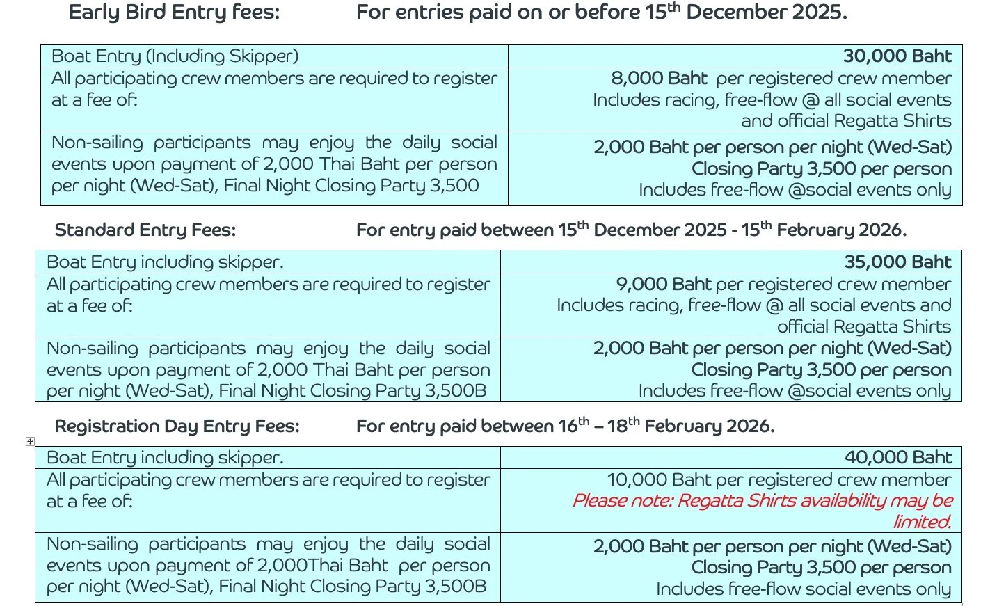 If written cancellation of an entry is received at the Regatta office before 1700 on Sunday 8th February, 2026. The whole fee, less a 6,000 THAI BAHT administration charge will be refunded. After this deadline refunds will be made only in exceptional circumstances.